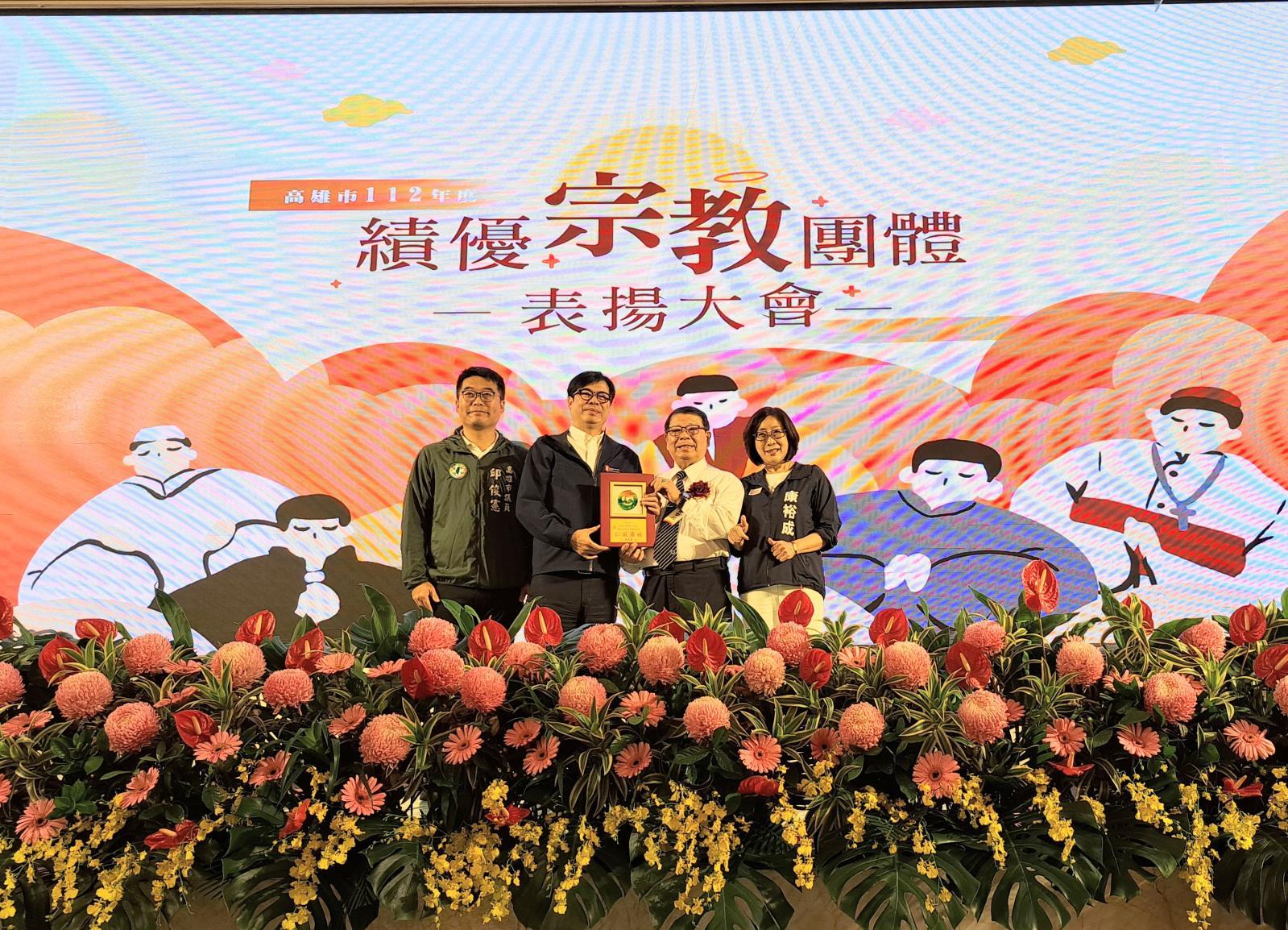 台灣高雄市政府民政局於2024年12月18日(星期五),假高雄市鼓山區林皇宮餐廳舉辦112年度宗教團體捐資興辦公益暨慈善事業績優表揚大會。本次頒獎典禮由市長陳其邁親自頒獎給所有受獎宗教團體,受獎一貫道宗教團體計有寶光建德神威天臺山(黃三燕壇主代表領獎)、寶光建德天臺聖宮(謝春旺壇主代表領獎)、興毅純陽聖道院,其他宗教團體接受頒獎共計有99個單位。陳市長代表市民誠摯感謝宗教團體的付出,特別是凱米颱風及山陀兒颱風侵襲高雄,造成嚴重破壞,在這期間許多宗教團體挺身而出,提供物資援助及心靈慰藉,與市府、市民一同度過難關。
