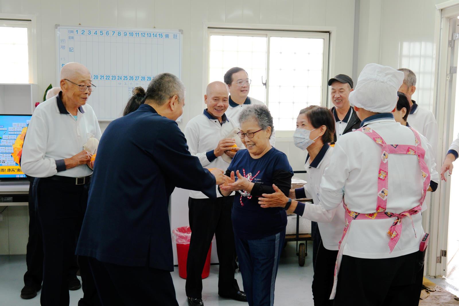 黃前人與各位點傳師和道親一起道喜慶祝後,黃前人智慧慈勉:「這個康芮颱風,就是要保佑大家『安康祥瑞』,風雨生信心,一個大道場的完成,需要集結眾人的力量,正所謂「人有誠,天有感」。寶光建德圓覺國際道場是大德林前人生前的遺願,北到南團結一心同心同德,這最後一塊拼圖,我們要承擔並且完成。」而黃前人在賜勉時,特別感謝天一道場前賢協助興建這個工務所,天和、天合、天本、明北道場同修共同護持,使得來到這裡的道親能有一個遮風擋雨的地方,以及天臺道場承包工務所內的水電、裝潢、苗新道場協助,今日還有道務中心王點傳師於凌晨四點即出發,帶領中心人才來到國際道場,協同幾位姑姑完成莊嚴又豐盛的供果擺設。供桌上除了有象徵「事事平安」(柿柿蘋安)的水柿和蘋果,更有兩個大蛋糕,祈願國際道場能圓滿順利建設完工。廚房膳勤由台北大香山的前賢掌廚,一早就料理了美味的早點,提供早到的道親們享用!