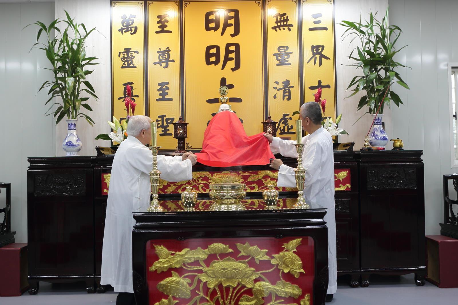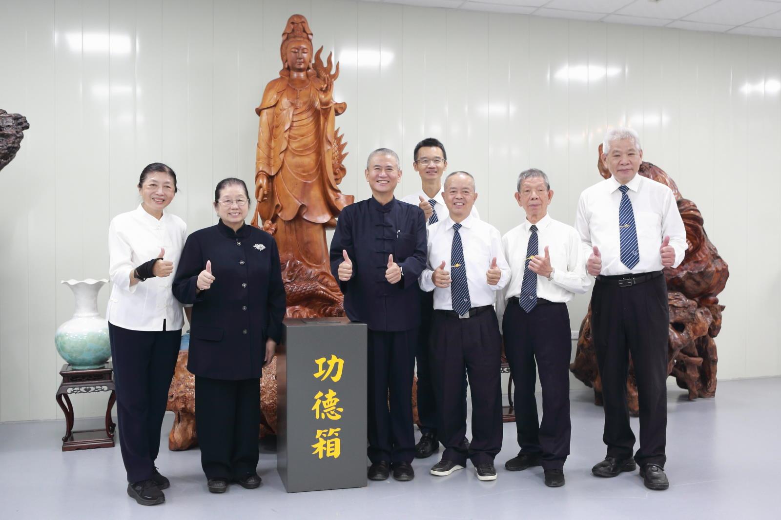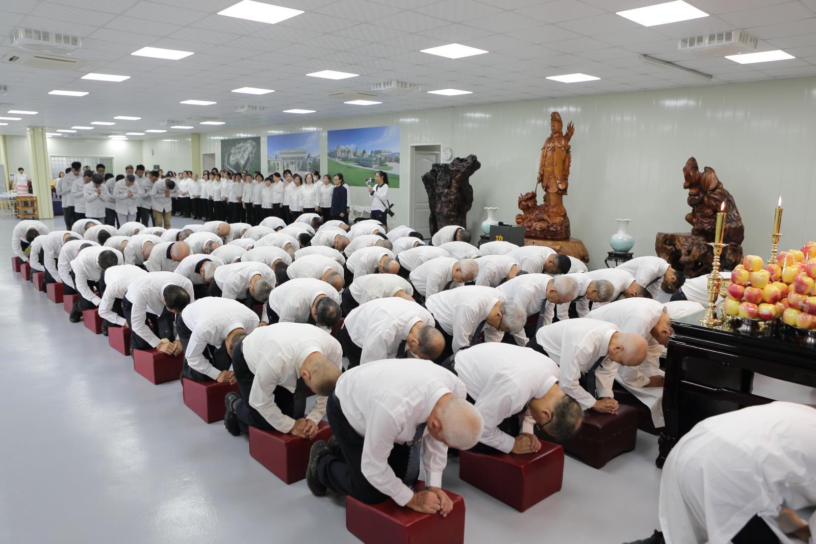 道喜完畢之後,由廖點傳師、賴點傳師共同辦理喬遷後臨時佛堂的第一場辦道儀式。因康芮颱風來襲,使得慶祝活動提前結束,但是感恩和喜悅的心情絲毫未減!各地道親前賢自由了愿,將自己的心意存入觀音聖像前的功德箱中,祈願寶光建德圓覺國際道場能順順利利、圓圓滿滿的興建完成,引渡更多有緣眾生!