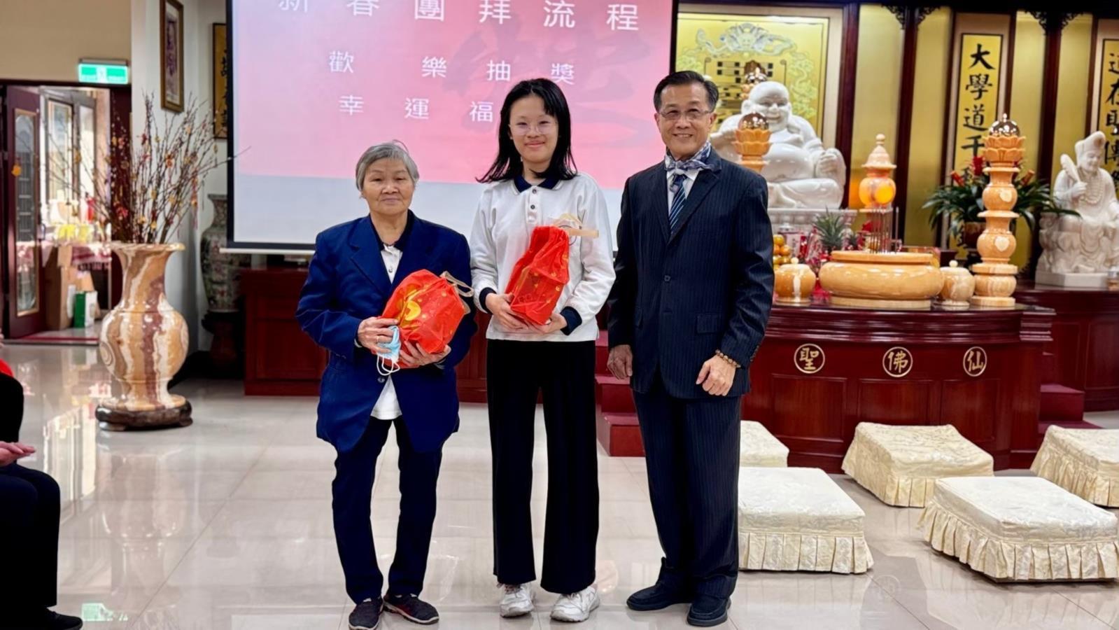 活動最後,天合道場李點傳師與明德北區廖點傳師等,慈悲為每位道親們賜平安果與新春紅包,象徵著寶光建德道場對道親們的關懷與祝福,祈願道親同修們在新的一年裡,平安吉祥,萬事如意。乙巳年天合道場新春團拜活動,在歡聲笑語中圓滿落幕。