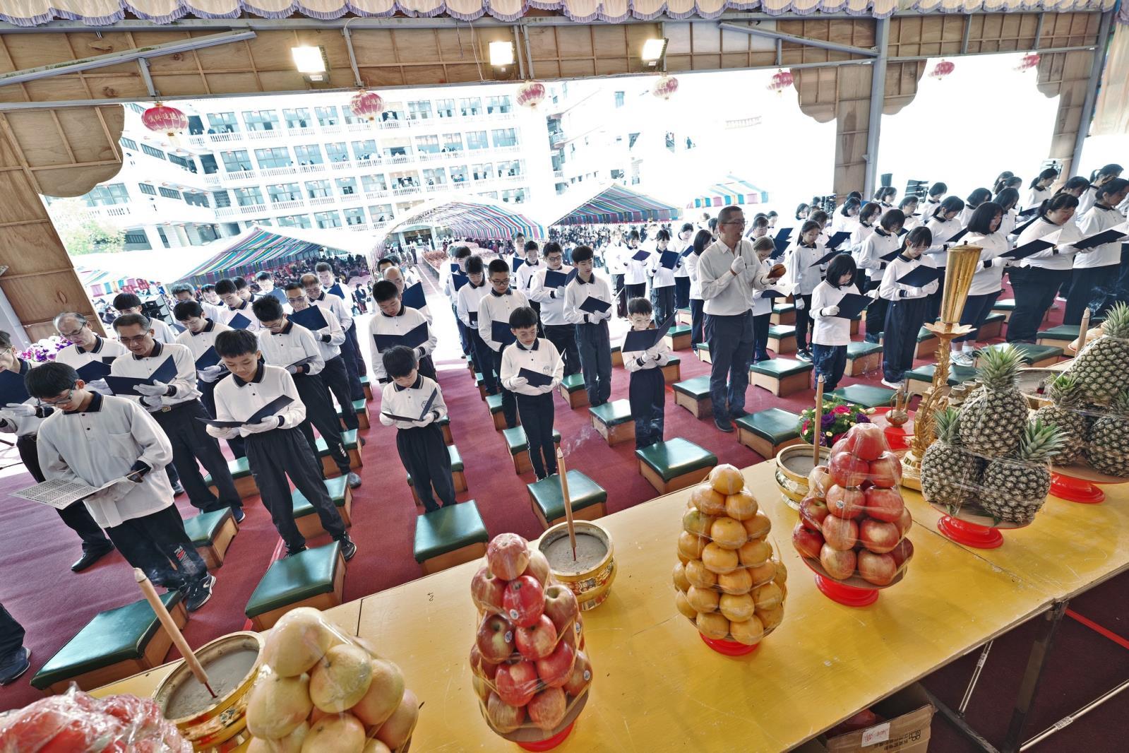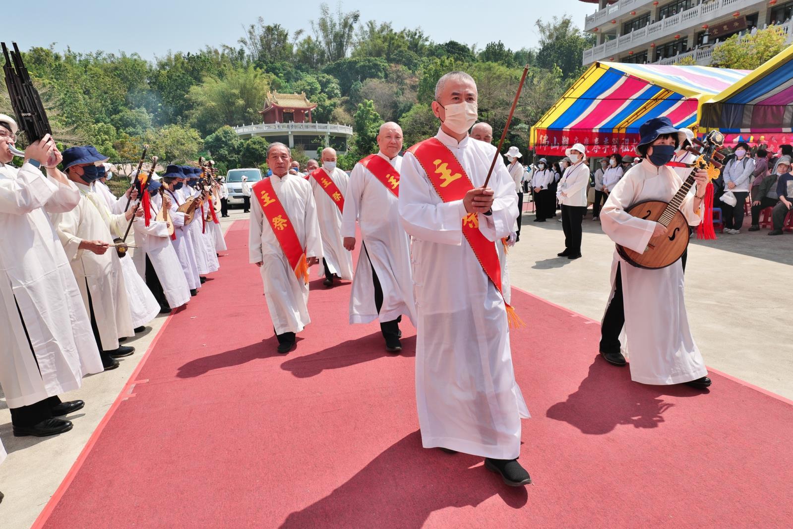 乙巳年農曆二月初十清晨時分已聽聞鐘鼓絲竹齊鳴,由天臺聖樂團的悠雅樂聲拉開了序幕,祭典開始首先恭迎神主牌位來到祭祖臺上,隨即在祭祖臺上舉行莊嚴殊勝的獻供禮,以表後代子孫對列祖列宗們的真誠敬意。