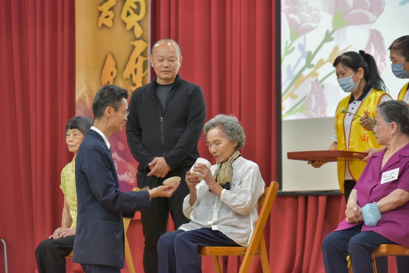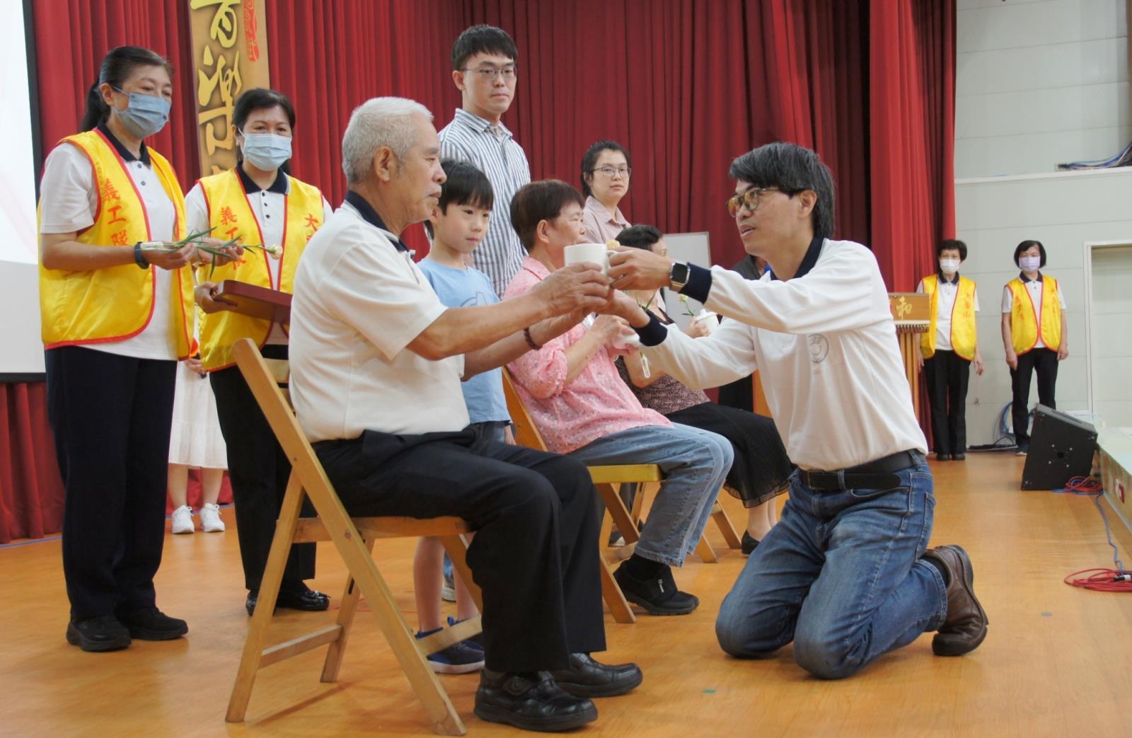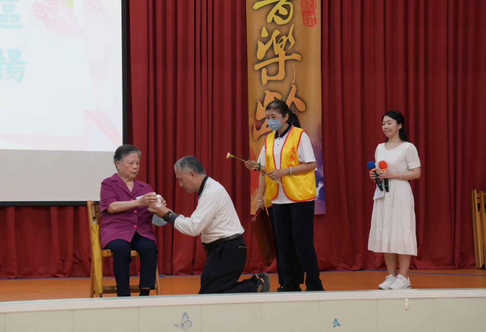 16區孝親楷模頒獎儀式隆重溫馨,透過奉茶、獻花與感恩話語,表彰每位孝行楷模對家庭的無私付出,彰顯道場孝道文化的傳承。此次活動為每區選出3 位孝親楷模+1位親屬到台上奉茶,流程步驟有四:先行禮、奉茶、獻花(康乃馨)及感恩的話此次主持人怕照相效果不理想,還特別示範了最佳奉茶的姿勢/位置標準的SOP,真的是很貼心,身在我們的道場真的是很幸福。16區孝親楷模前賢們各有各的優點與值得我們學習的地方,真的是家家有本傷腦筋-錯!應該是真腦筋,後學印象最深刻的是形容媽媽小小的身軀,但是有大大的愿力,能當您的小孩真幸福,您說是不是呢?