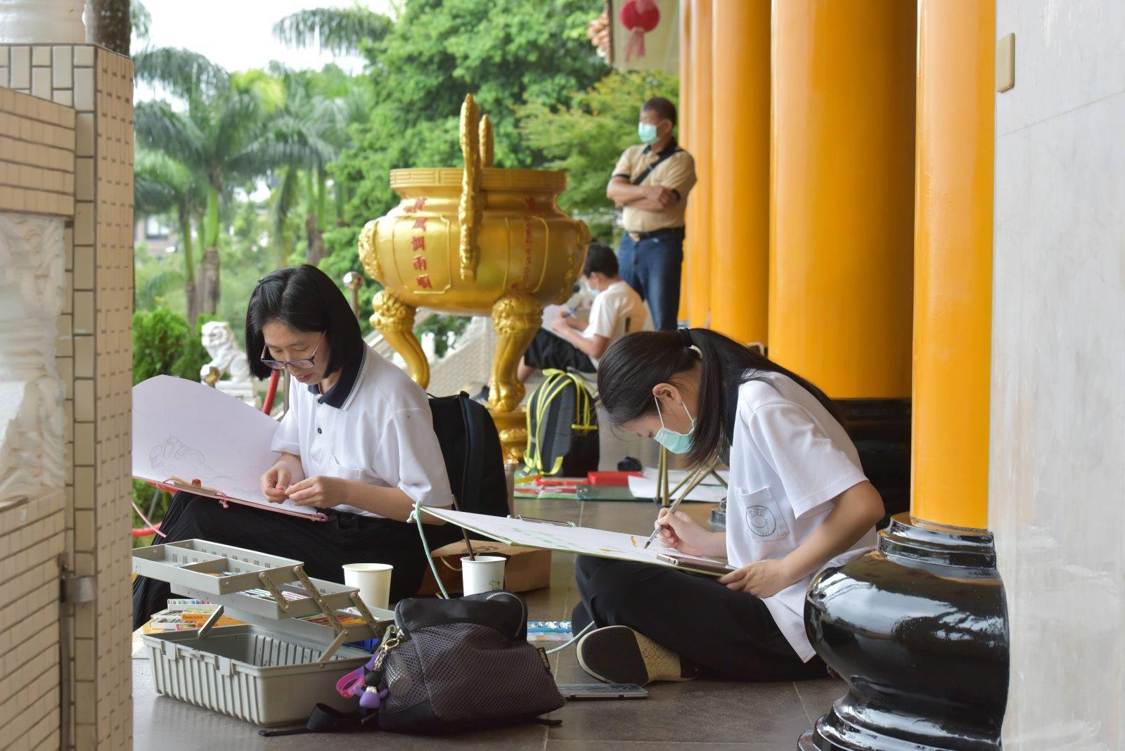 往年活動總是艷陽高照,參與活動的大小前賢們總是一邊揮汗如雨一邊作畫。今年老母娘體諒大家辛苦,特發慈悲,天降甘霖。在炎熱的七月天給大家帶來一絲清涼。各位前賢在室內作畫除了更加舒適外更能仔細觀察大香山的建築布局。創作上也更契合今年的主題:「大香山建築之美」。