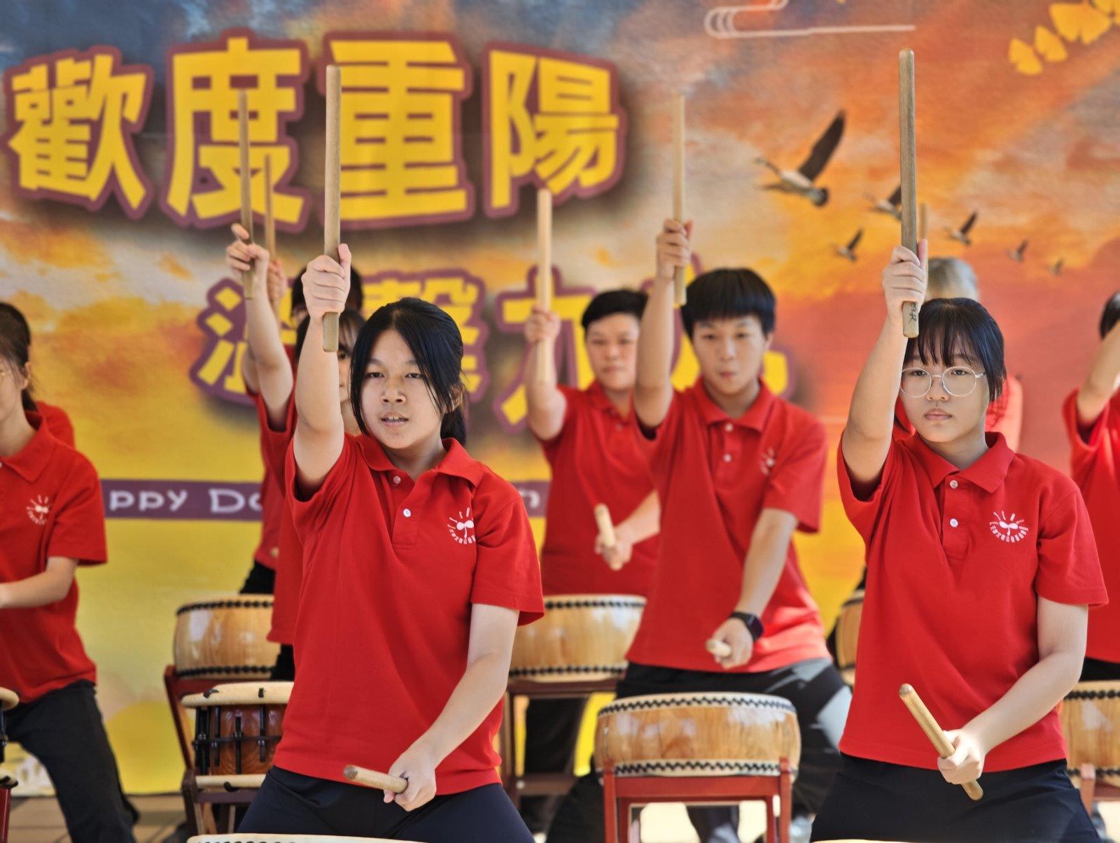 活動以鼓聲揭開序幕,由天律太鼓團帶來震撼人心的表演。首先登場的是太鼓團「淼」演出曲目〈戰〉,鏗鏘有力的鼓聲象徵生命的堅韌與奮鬥,展現長者不畏風霜、持續奮進的精神;隨後由太鼓團「森」帶來曲目〈春漫〉,節奏柔中帶剛,鼓聲如春風般溫潤,寓意著重陽佳節中的溫情與祝福。兩段演出節奏分明、層次豐富,震撼全場,掌聲經久不息。