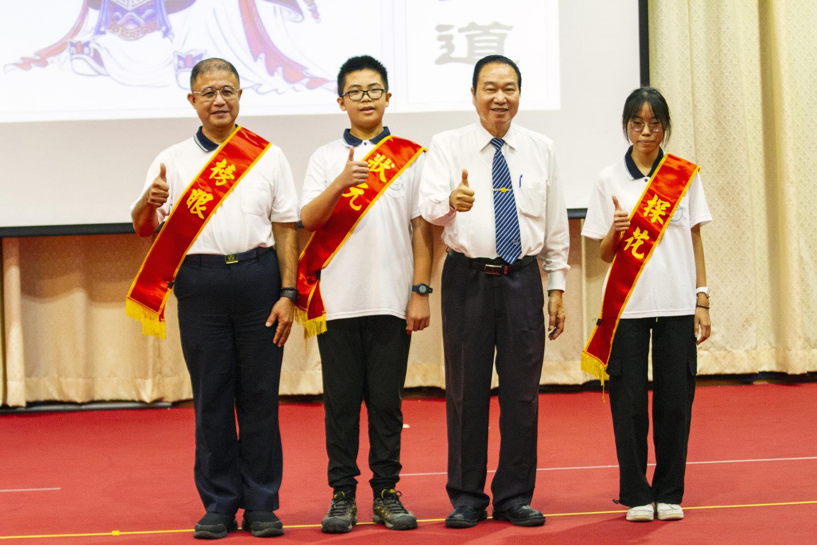 為了鼓勵更多人參與,會考設有多層次的獎勵制度。個人獎方面,依通過關卡數分為「小天使」、「小秀才」、「小進士」、「小狀元」等等,並從全體考生中選出「狀元」、「榜眼」、「探花」。此外,還有「菁英獎」、「經典卓越獎」等,分別表揚各德的優秀代表與全程通過三十關的卓越考生。團體獎則以德別為單位,分別頒發「報考人數最多獎」及「累積關數最多獎」,激勵德內學員共同精進。去年特別新增「三代同堂獎」,凡一家三代共同參與考試即可獲獎,今年已增加為九個家庭報名參與,顯示越來越多家長願意帶領子女一同讀經,身體力行推廣齊家讀經的風氣。