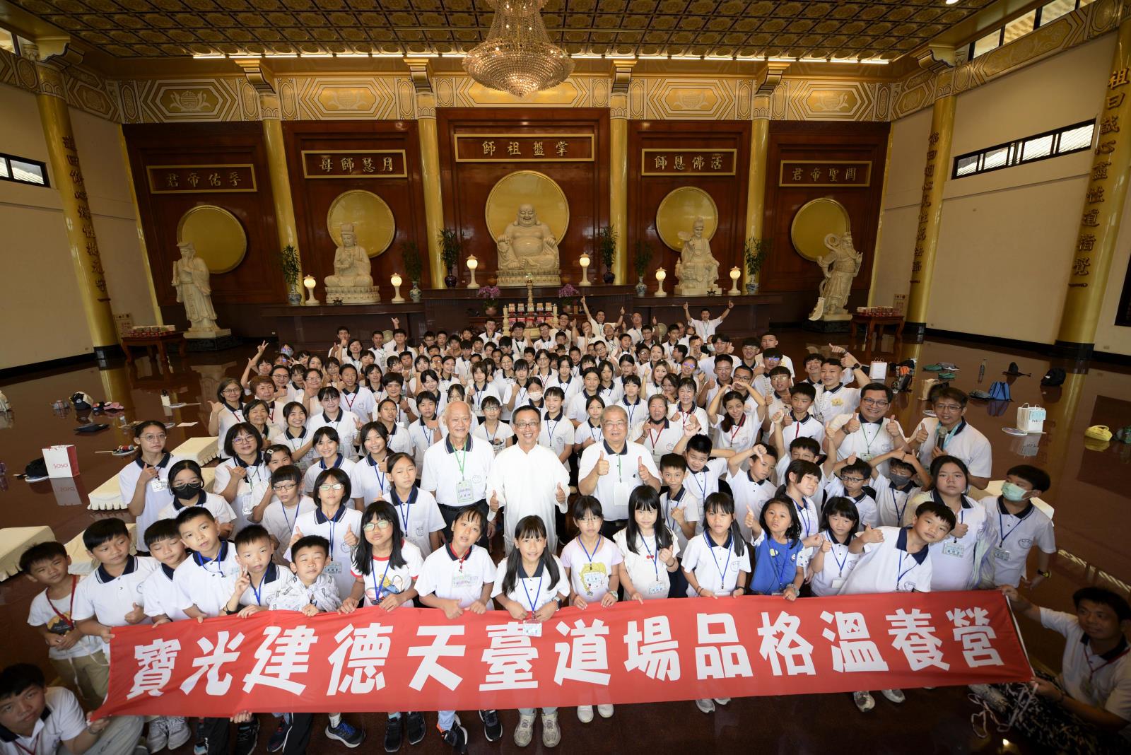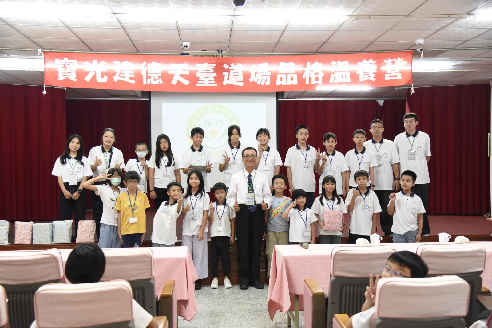 國小三年級到六年級的建幼小天使最引頸期盼的寶光建德天臺道場品格溫養營,於2024年8月10日-11日在台南佛山觀音巖展開,今年吸引近八十名學員,加上護持工作人員,共近二百人熱情參與。此次營隊主題取自於弟子規裡的「汎愛眾」,三堂主課的課程,兩堂體驗課的手作作品,「營呼」、「營歌—白陽小天使」在整個營隊中穿針引線著,還有復刻五六年級生的青春回憶—營火晚會,營火的光和熱溫暖每個人的心,凝聚全場大小朋友更深厚的道情,成為本次營隊最亮點;兩天一夜營隊活動旨在溫養,做個「仁愛」的白陽小天使。