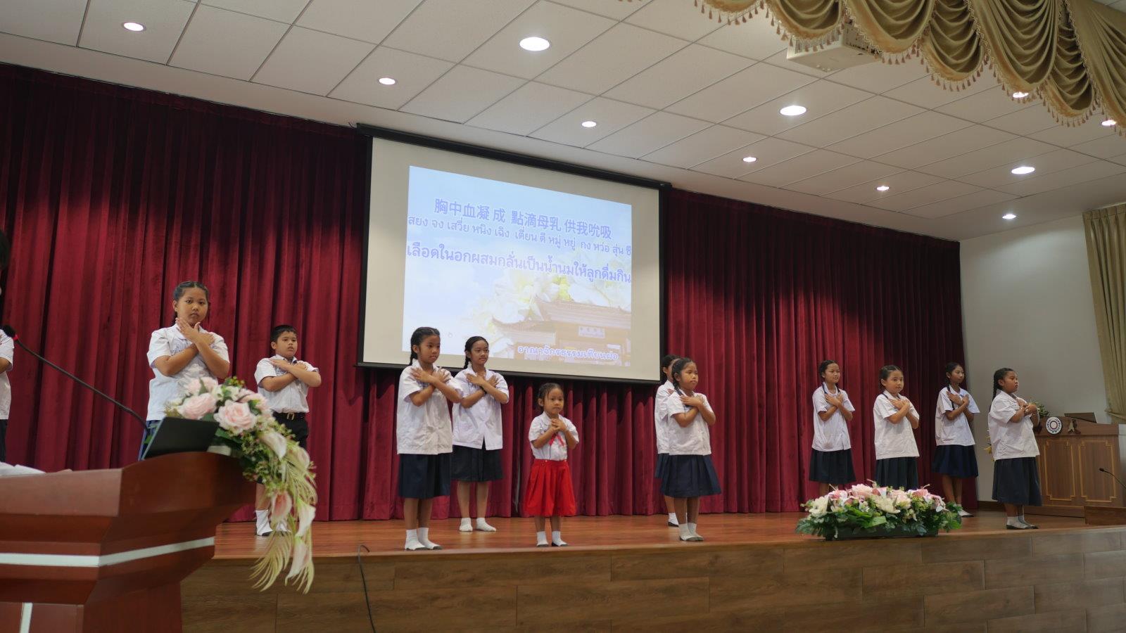 讀經班的小朋友們帶來了泰國非常著名的歌曲《母乳恩》,這首歌曲的歌詞通過母乳來象徵母親無私的愛與養育,講述了母親如何用她的乳汁滋養孩子,並將生命的延續與深情融入其中。孩子們用純真而深情的手語表達了母親對他們生命的影響與無私的奉獻。孩子們的表演觸動了在場每一位母親的心,大家無不被這份深情所感動。