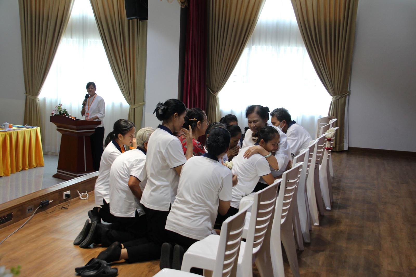 節目壓軸以參加同修向母親表達感謝的儀式畫下句點,首先邀請母親坐在舞台椅子上,同修站立在母親面前行泰式的敬禮,同修們給自己的母親獻上自己做的花環,並在母親的腳下跪拜,這個畫面感動現場,大家熱淚盈眶,這樣的儀式提供了同修一個難得向母親表達感謝的機會,也讓同修們回憶起更多的昔日母愛。