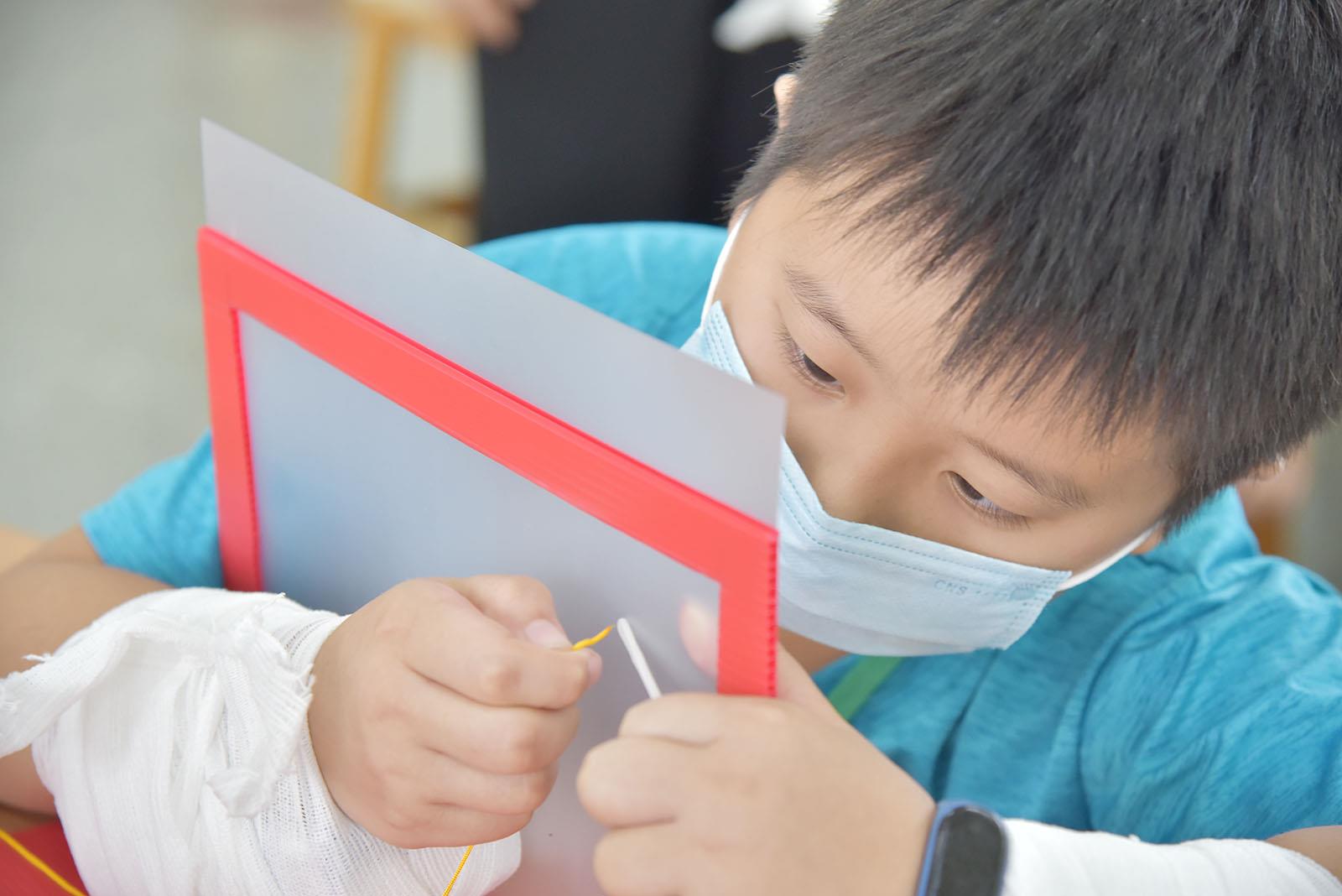 第二天一進校園孩子們就開始進行以身試老的活動手腳綁上鋁箔包體驗長輩的不便感受,闖關中也體驗到當視力模糊時穿針引線的不清楚,更能同理長輩老化心情。