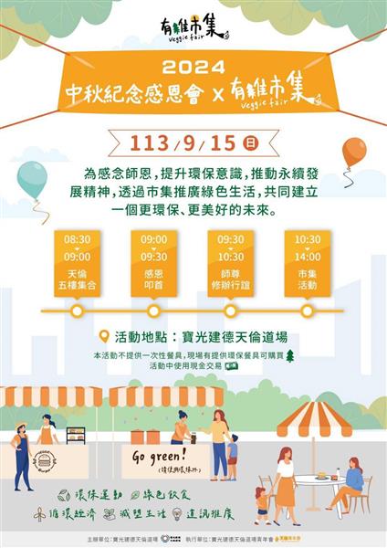 中秋佳節,月圓人團圓,此刻更是師尊成道之日,為了感念師尊對道脈傳承之恩德,承繼往開來之志,天倫道場於2024年9月15日舉辦了中秋紀念感恩會;感恩會由天倫道場青年同修籌畫主辦,各德區道親協辦,藉此活動讓道親們了解師尊修辦道的精神。另一方面,有感於環境永續之重要,因此除了感恩會以外,還規劃了以環保為主題的「有維市集」。希望透過活動能夠維繫凝聚道情與向心力,而且能夠提升環保意識。此外,當天的工作人員皆以青年人才為主,冀望能實現「一貫道需要青少年,青少年需要一貫道」之目標,使道場青年經過道場培育與薰陶之後,都能夠有了愿的舞台,秉持繼師志、承師德之宏願,傳承永續!